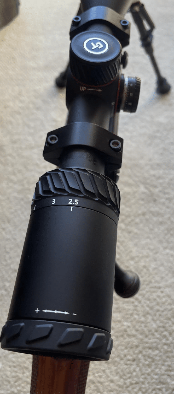 The Plex reticle is the star of this scope with the level of clarity and contrast it displays through the lens. You can adjust the strength of the Plex reticle with the front knob (ReticleFocus/DiopterAdjustment). For example, if you’re shooting at the first light or the golden hour, a traditional Mil-dot reticle can be too faint at further distances.